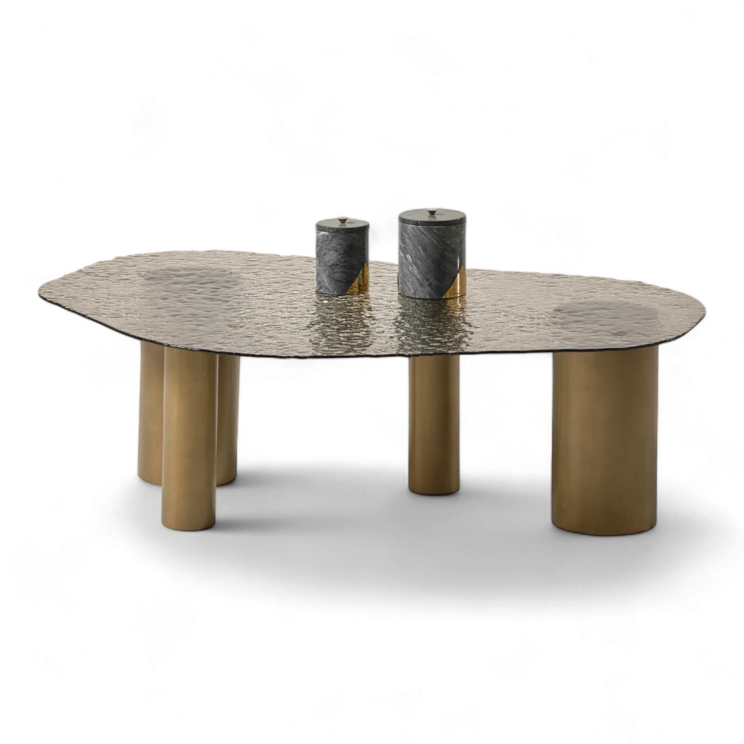Her detayında ustalık, her yüzeyinde karakter taşıyan bu orta sehpa; yaşam alanınıza sadece işlev değil, aynı zamanda bir sanat eseri hissi katıyor. Dokulu cam yüzeyi, ışığı farklı açılardan yansıtarak mekâna derinlik ve hareket kazandırırken; mat altın tonlarındaki silindirik ayaklar, güçlü ama sade bir duruş sergiliyor.