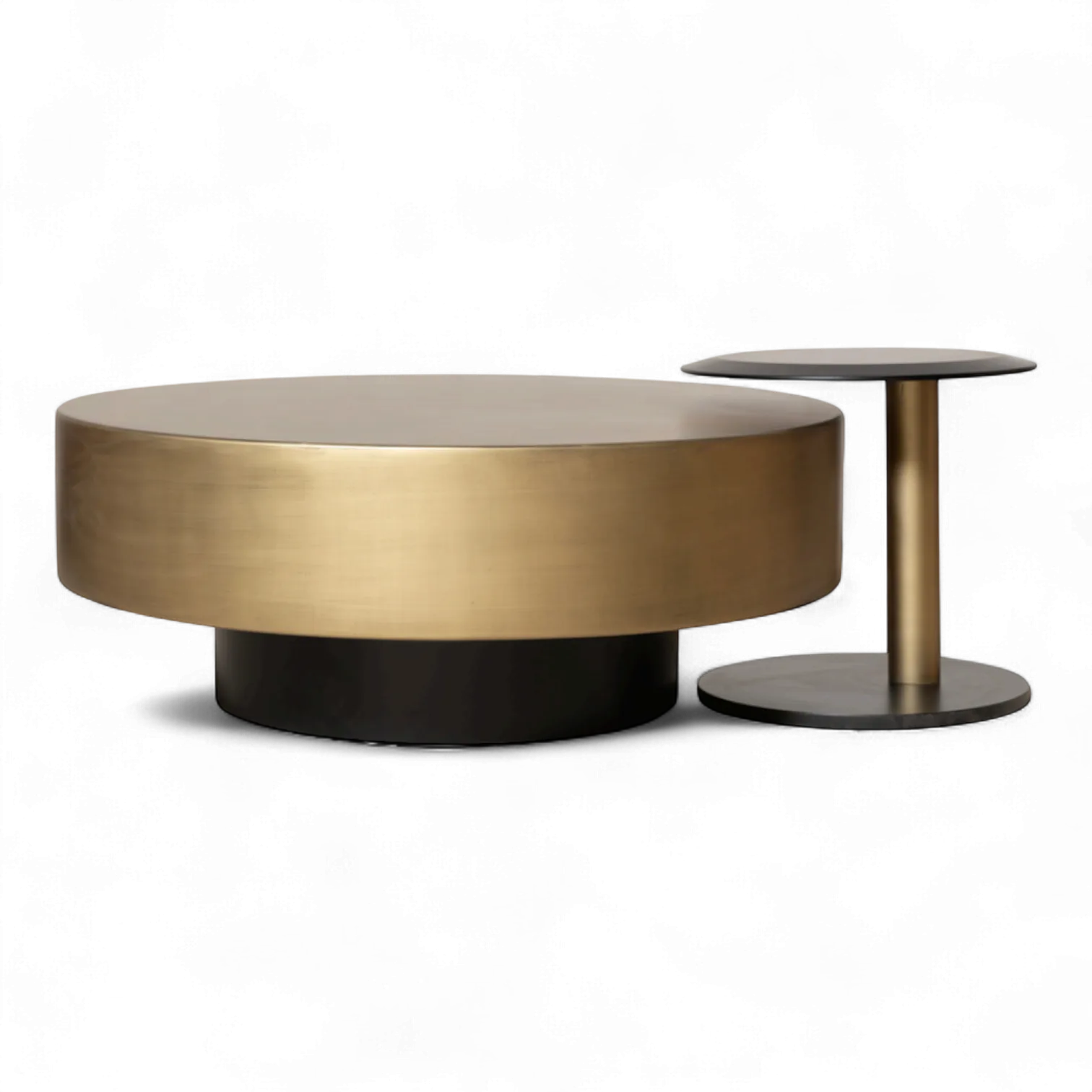 Malzeme Kalitesi: MDF üzeri fırçalanmış metalik gold yüzey, ışığı zarifçe yansıtarak mekâna sıcaklık ve sofistike bir hava katar. Mat siyah lake boya silindirik baza ise denge ve kontrast sağlar; görsel olarak güçlü, fiziksel olarak sağlamdır.