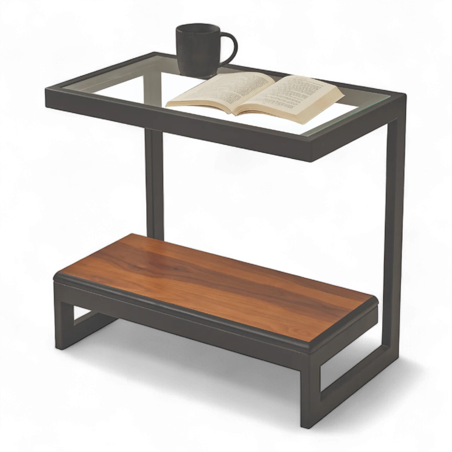 Minimal çizgilerle tasarlanan metal taşıyıcı yapı, cam yüzeyin hafifliğiyle dengelenir. Alt katmandaki ahşap raf detayı, tasarıma sıcaklık ve işlev kazandırırken çizgisel formu ile modern mekânlara güçlü bir düzen hissi sunar.