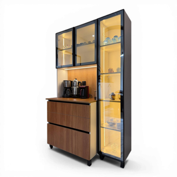 Kastamonu Entegre trend gri panellerden oluşan suntalam gövde, tezgah ve kapaklar mdf kastamonu entegre teak görünümlü panellerden oluşur, tezgah arası ahşap Agt marka teak görünümlü mdf panellerden lambri desen. Üst kapak ve yan vitrin kapakları alüminyum gövde kendinden kulplu füme reflekte camdan oluşmaktadır, tezgah arası led aydınlatma ve dolap içlerinde led aydınlatma bulunmaktadır uzaktan kumanda ile kontrol edilmektedir. Çekmeceler c profilden gizli kulpludur. çekmece ve kapaklar samet marka yavaş kapanır menteşe ve raya sahiptir. Ayaklar 10cm yüksekliğindedir, altı süpürülüp silinebilir ve su değmemesi için bu şekilde tasarlanmıştır. Ürünün 2 yıl garantisi vardır. Ürün duvara asma gerektirmez üst modül alt modüle bağlantılıdır. Led aydınlatma için fiş çıkışı verilmiştir sadece prize takması yeterli. Tezgah:90cm, Vitrin:40cm genişliğindedir.